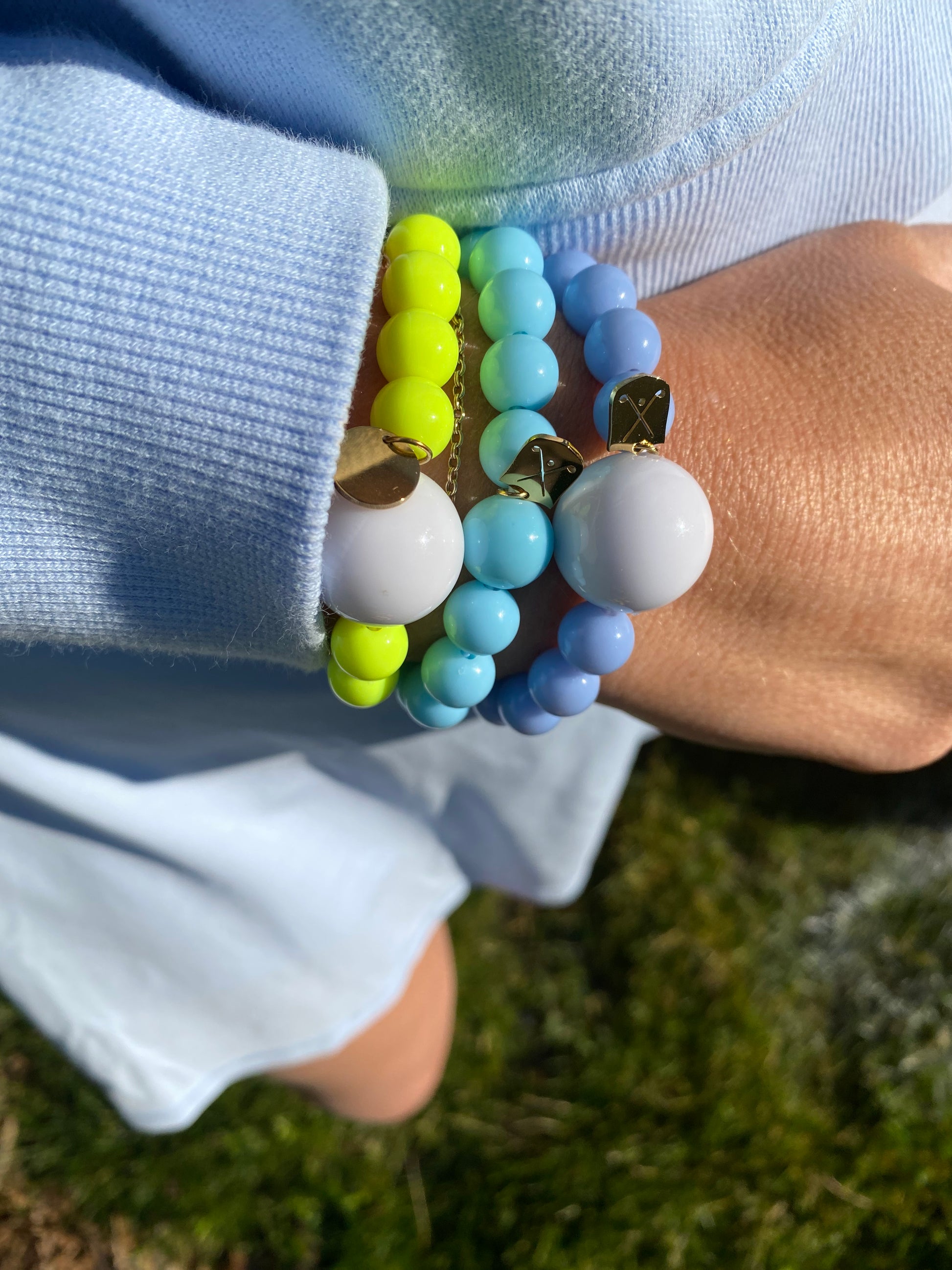 - Elegant Elements: This captivating bracelet boasts a prominent Large Shiny White center bead, encircled by ten strokes of Shiny Neon Yellow Acrylic. The neon yellow beads radiate a happy brightness, making a bold statement on the golf course.