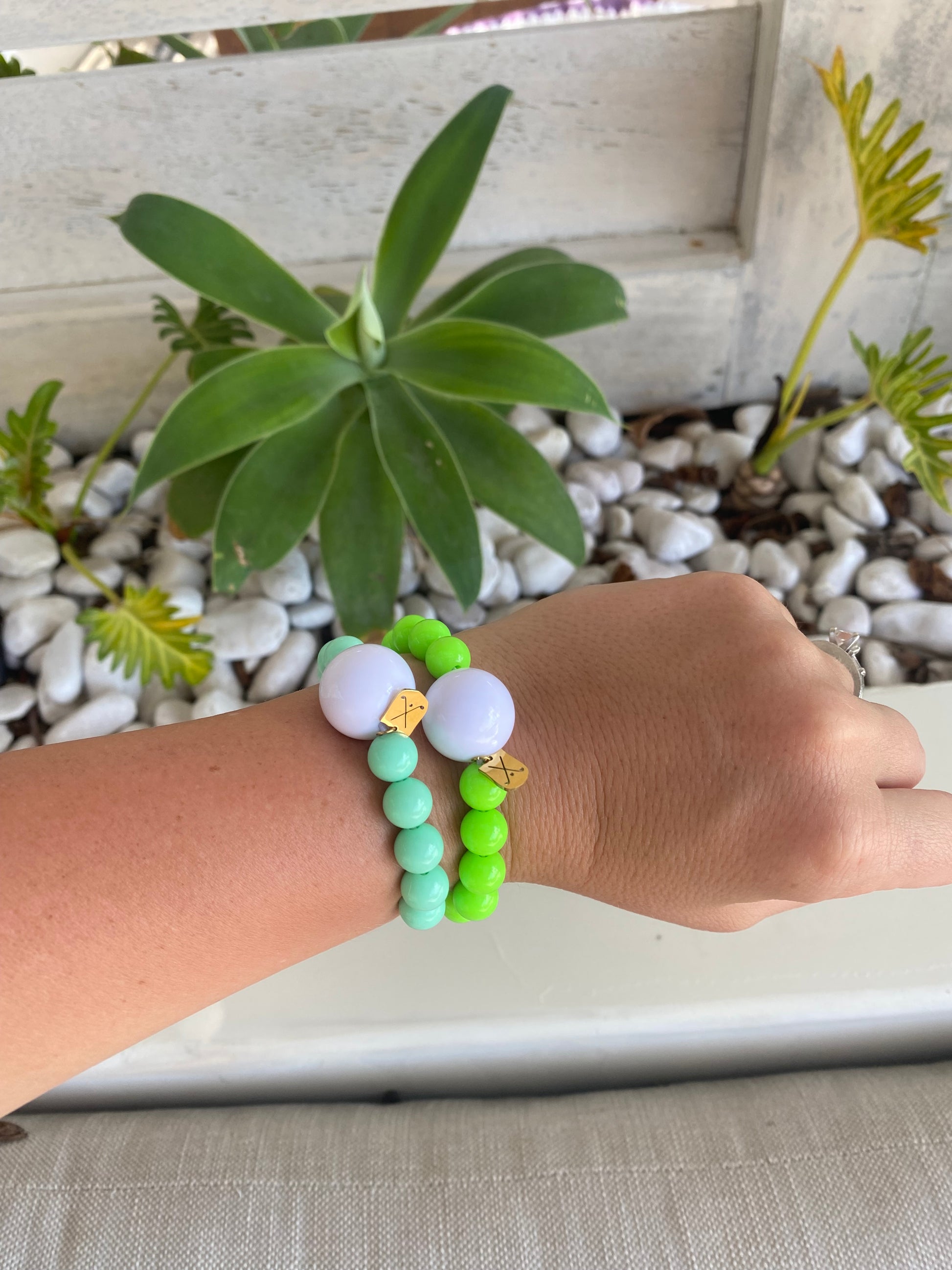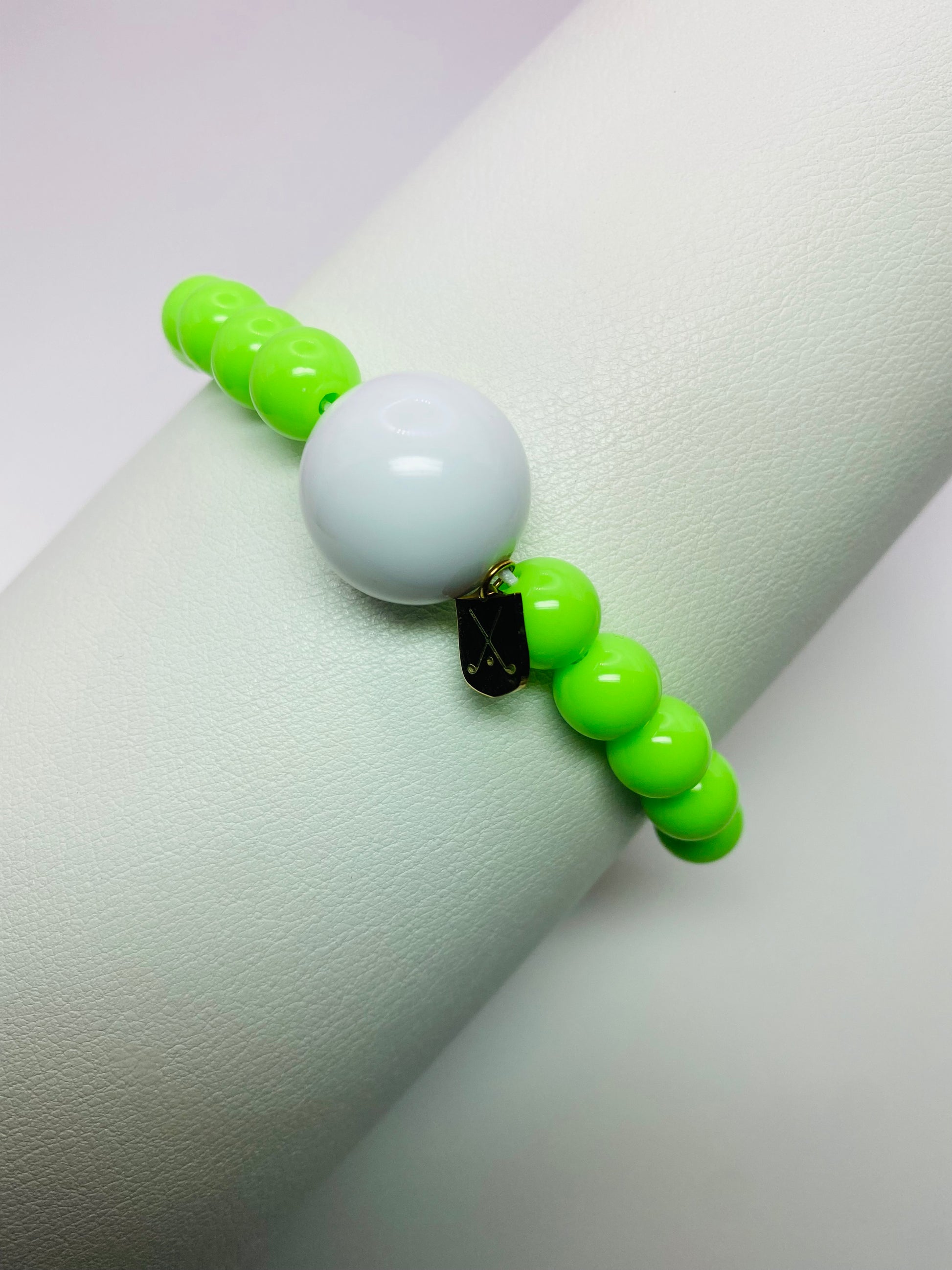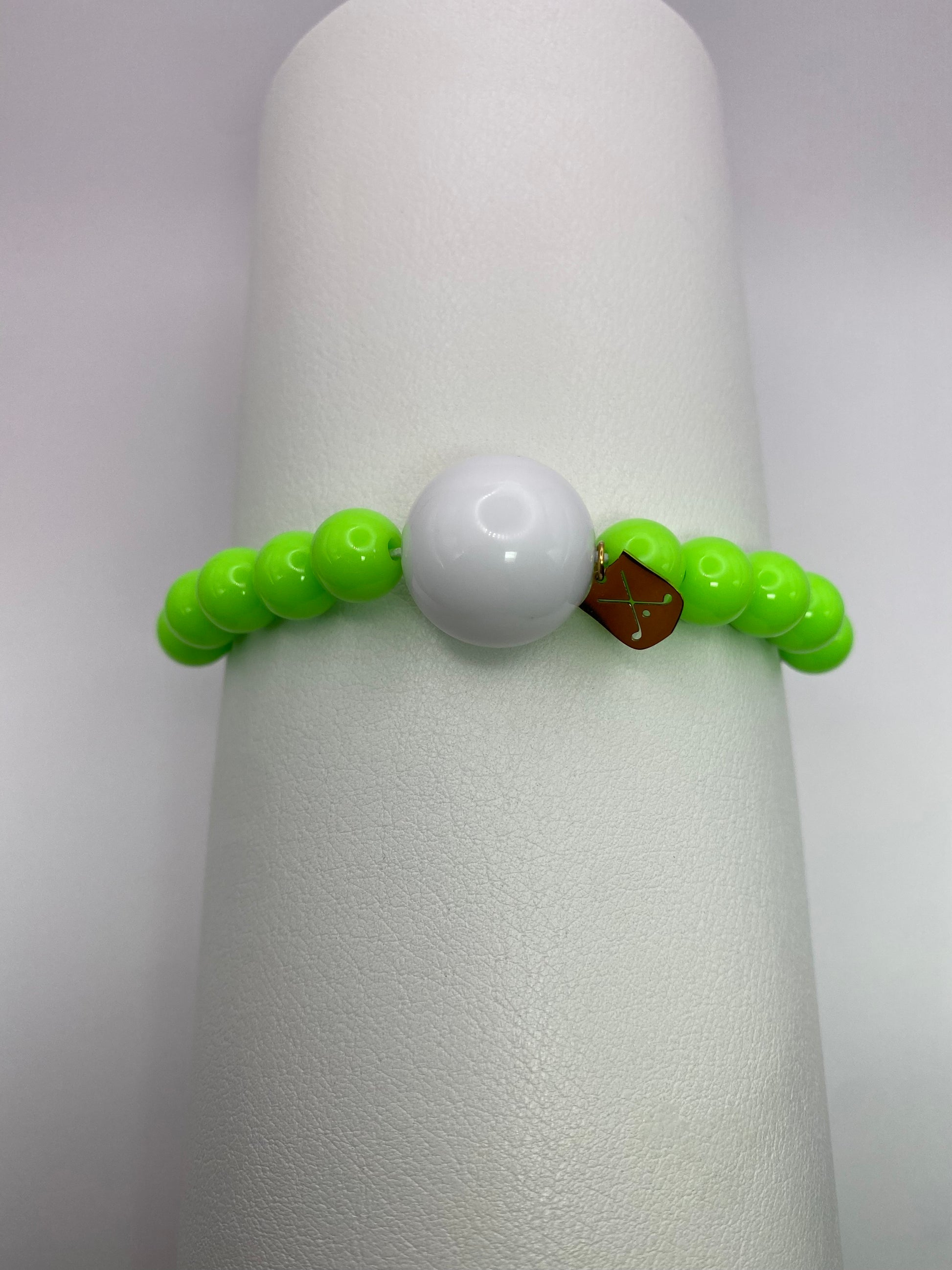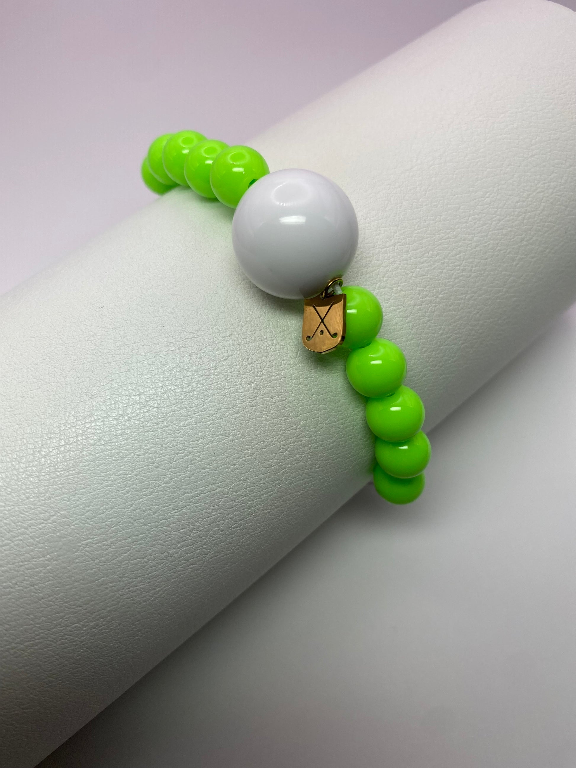 This captivating bracelet boasts a prominent Large Shiny White center bead, encircled by ten strokes of Shiny Neon Green Acrylic. The neon green beads radiate a happy brightness, making a bold statement on the golf course. The High-Quality Elastic in classic white guarantees a comfortable fit, adding an element of sophistication to this lively accessory. Each bracelet is adorned with a high-quality logo charm, showcasing our commitment to superior craftsmanship.