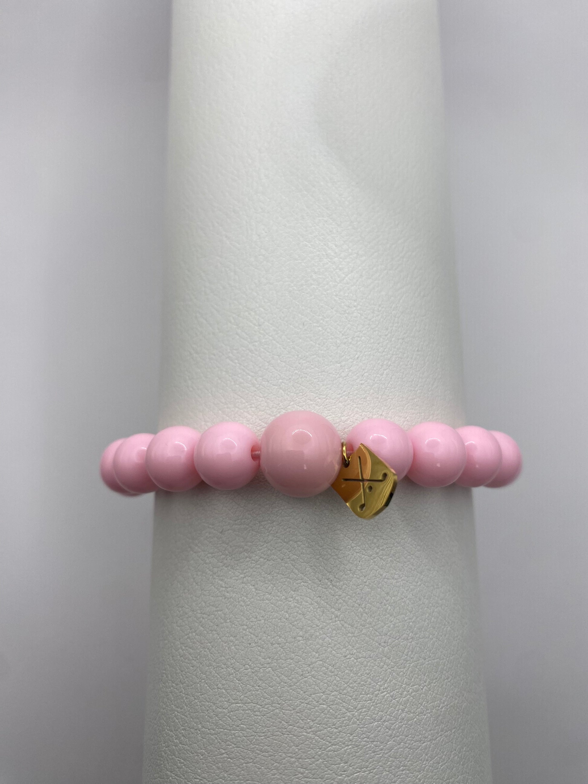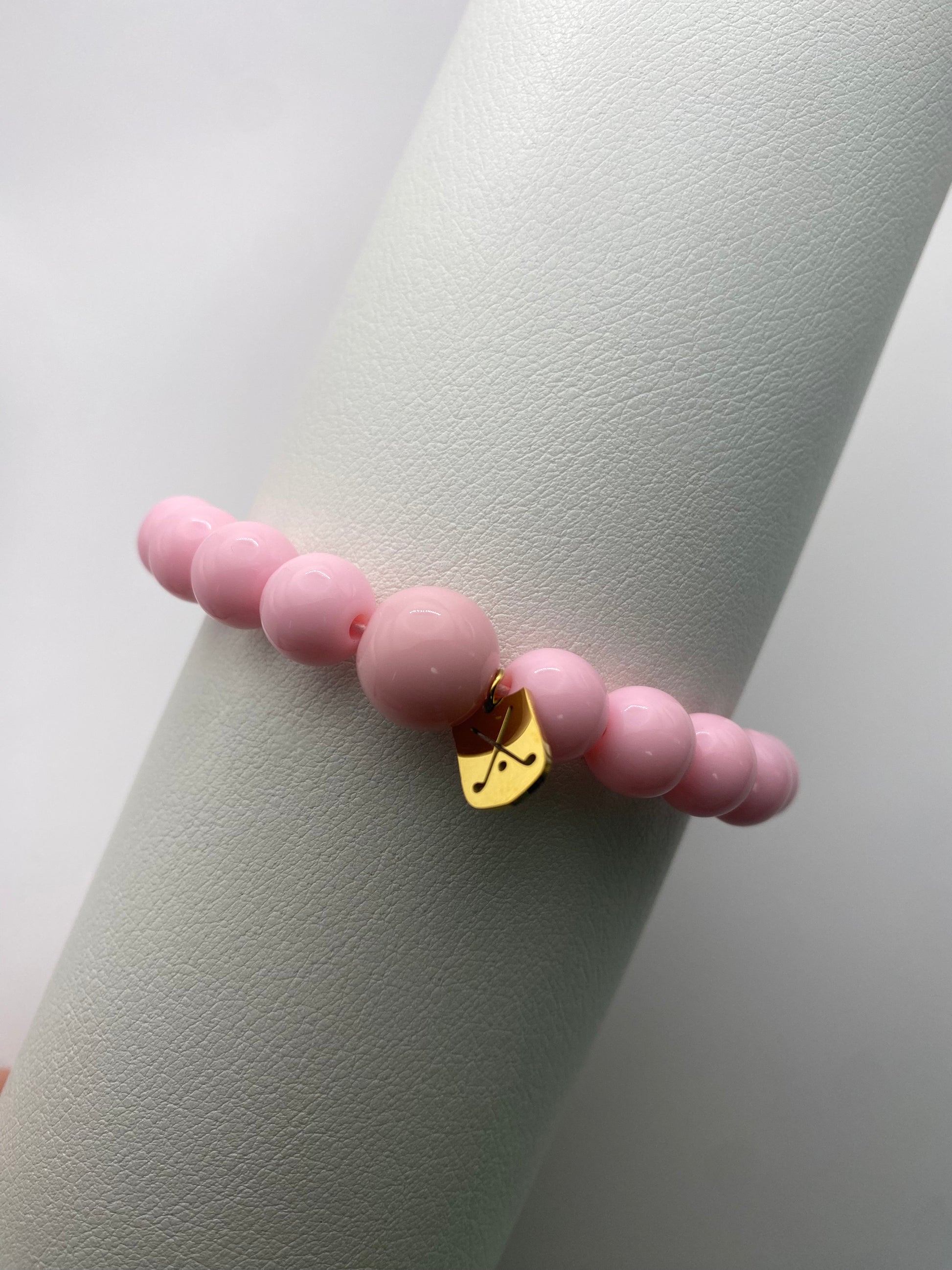 Crafted with meticulous attention to detail, the bracelet features a stunning Shiny Blush Pink Acrylic bead at its center, surrounded by ten strokes of Shiny Blush Pink Acrylic, each meticulously chosen for a touch of elegance. The high-quality and comfortable elastic in matching Blush Pink ensures a seamless fit, while the exclusive logo charm adds a touch of sophistication.